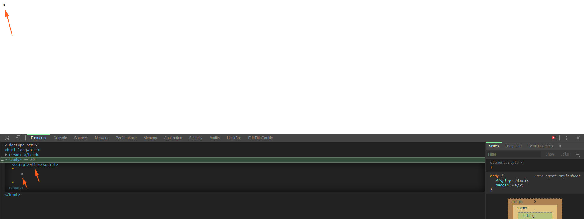 从图中我们可以看出来,’<’ 标签已经被转义,但是只是作为纯字符输出在页面中。之后的 由于未配对成功而被解析器去除。